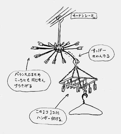 これで狭いスペースにも全ての洗濯物が干せる。実際やってみると、その姿はクリスマスツリーのようにエラいことになる。ツナギは完全に床に触れる。