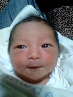 ヨメの布団の脇に座り抱いていると、寝ていた御子が腕の中で目覚めた。だが泣くわけでもなく、ただ大人しくぽや〜〜・・・とまどろんでいる。