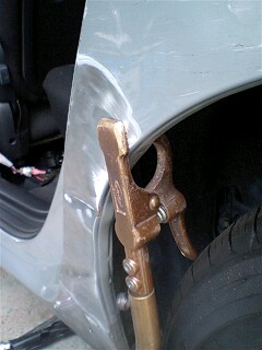 凹みの程度によっては、特殊な工具を用いて裏からピンポイントに押し出すデントリペアというやり方もある。この方法は上手くいけば塗装すら不要になる画期的技術なのだが、TACは個人的にあまり好きではないのでココでは無視する。(うをい)