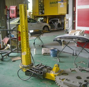 フレーム修正は、軽度のものならチェーンブロックを使って人力で引っ張ることもあるが、多くの場合はドローアライナーという大型の機械で行う。