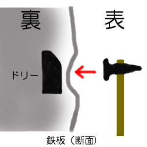 ハンマリングによる打突に、スタッドによる加熱・・・損傷が激しいほどこれらの作業も長引き、鉄板はより一層のストレスに晒されることになる。その結果、いともたやすく延びてしまうのだ。