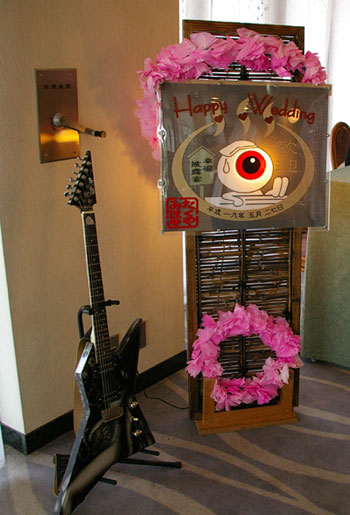 受付にはぼっくん力作の目玉親父ウェルカムボード(→)とブータンの牛鬼ギターが展示してあった。