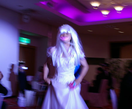 仕上げに白いウィッグを被り、ブーケ代わりにヨメが和装で頭に付けていた花型の髪飾りを手に持つ。