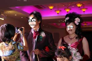ヨメの赤ドレスはなかなかセクシーだと思うが、TACのこのタキシード・・・貸衣装屋で最初に見たときの第一印象は「なんだかインチキマジシャンみたい」。