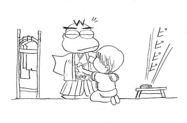 「お」→「し」と来て、三番目のシローが「り」。周りから突っ込まれて着替える。(ベタなボケだ)