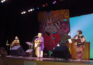「まちづくりサミット」の後は「妖怪ミニコンサート」である。ステージには水木先生がデザインし、地元の小学生によって着色された巨大な凧が飾られている。