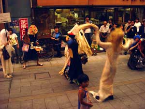 「百鬼夜行」は八日市駅からスタートして商店街をパレードするわけだが、その道中に一箇所「審査ポイント」が設置されていて、審査員の前でちょっとしたパフォーマンスをする時間が与えられている。これは別に強制ではないのだが、ここでいかに自分の妖怪扮装をアピールするかが賞をゲットする上での重要なポイントとなるのだ。