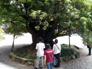 本堂前の広い庭には、「木娘」に化けるという樹齢数百年のタブの木と、「左近の南天」がある。