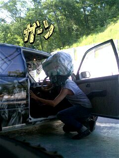 (*)自動車のトランクステーを再利用し、持ちやすく改良してあります。でもさらに重くなりました。腕が鍛えられます。 (2)装着者の冷却方法について