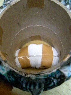 ●ダンボール(メインフレーム)―――――軽量化対策 ●スポンジ(肉付け) ●発泡スチロール(第一次成形) ●障子紙(第二次成形) ●合成樹脂塗料エクセルテックス(コーティング) ●ラッカー塗料(エアブラシによるディテール描写) 結果―――軽量化対策は失敗 |