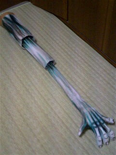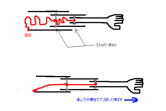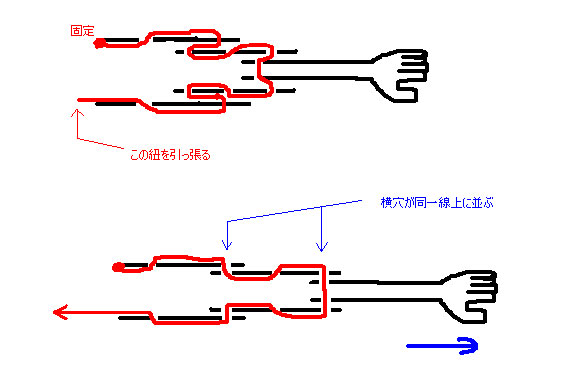 アームを構成する三つの筒には複数の横穴が開いており、縫うように紐が通してある。