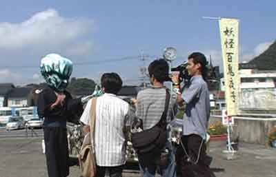 百鬼夜号の前で、テレビカメラに見つめられながらインタビウ開始。
