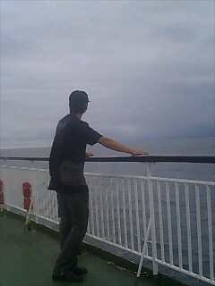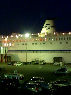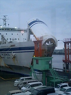 フェリーターミナルで乗船手続きを済ませ、夕飯にラーメンを食っていると、車両乗り入れ案内のアナウンスが流れた。