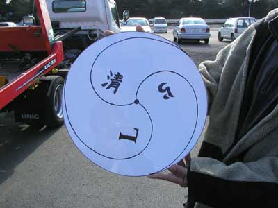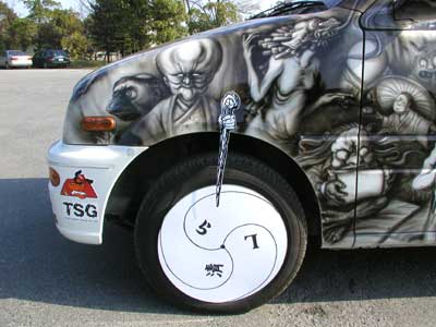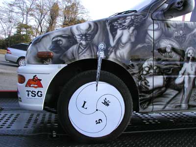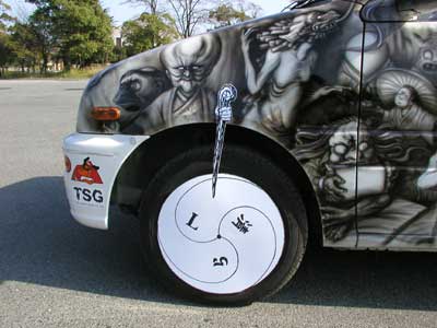 このルーレットを積載車のスロープ上に停車させた百鬼夜号の左フロントタイヤに取り付けるわけですよ。