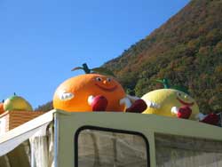 そのあとは御土産屋さんで物色したり、ミカンのオブジェと噴水がある広場で恥ずかしい写真撮影会をしたり。(→)