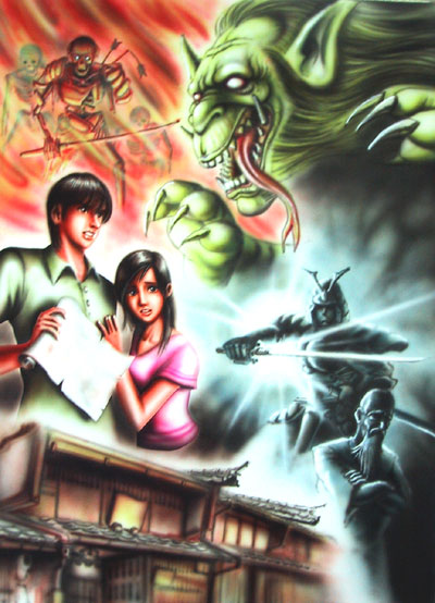 「ある日発見された古文書。そこには、太古からこの地に棲みし邪悪なる魔獣の伝説が記されていた。かつて金森長近が美濃の町を設立する際に彼の手によって封印されたこの魔獣は、その後も幾度となく復活して美濃を業火に包むも、その都度勇気ある者たちの手によって封印されてきた。・・・そして現代。400年の時を経て、今まさにその魔獣が復活しようとしている。美濃の町を護るため、村瀬藤城が遺した封印の言葉を捜せ!」という史実を完全に無視したでっち上げストーリーが存在します。少しでも多くの人が騙されてくれるように、映画のポスターのような雰囲気を狙って描きました。