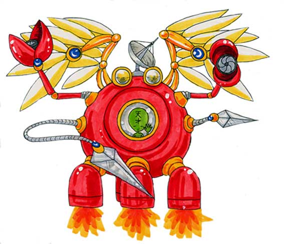 | 必殺技? | 両手のハサミ 切ったり殴ったりつまんだり。 ミサイルも出ます。 頭のアンテナ 足のナイフ 頭のライト 羽 |