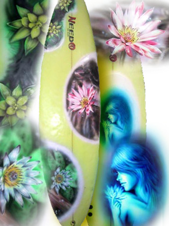 初めてボディーボードへのブラシを依頼されました。注文内容は「睡蓮の花」・・・・・海で使うのに睡蓮??と不思議な気もしましたが、案外ありたきりなハイビスカスなんかよりは新鮮かもしれません。